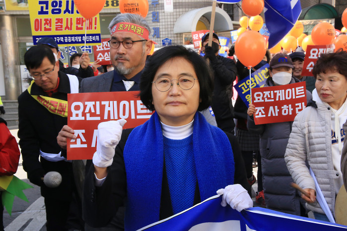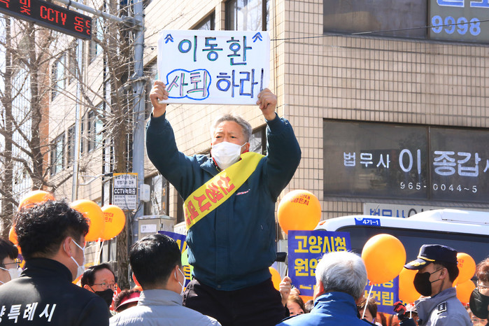 [사진설명] 고양시민들이 이동환시장 사퇴하라고 이야기하고 있다.