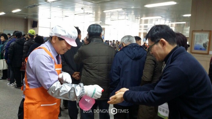 | △김 교육장과 직원들은 빛고을노인건강타운 어르신 1000여 명의 손에 배식 받기 전 소독을 하고 있다. |