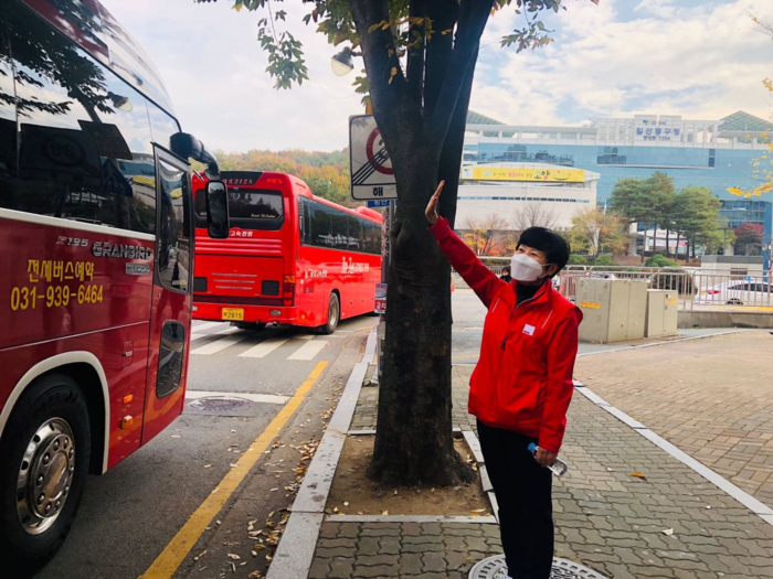 [사진 설명] 세종시로 총파업을 떠나는 조합원들에게 인사하는 송영주 진보당 고양시지역위원회 위원장.