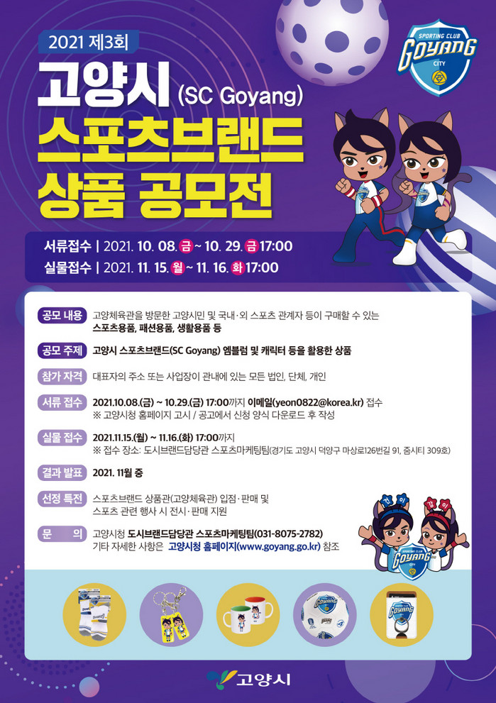 [부자동네타임즈 김인수기자] 고양시가 관내 우수 기업 및 브랜드상품 발굴을 위해 제3회 스포츠브랜드 상품 공모전을 실시한다. 서류접수 기간은 10월 8일(금) ~ 10월 29일(금)이며, 실물접수 기간은 11월 15일(월) ~ 11월 16일(화)이다.