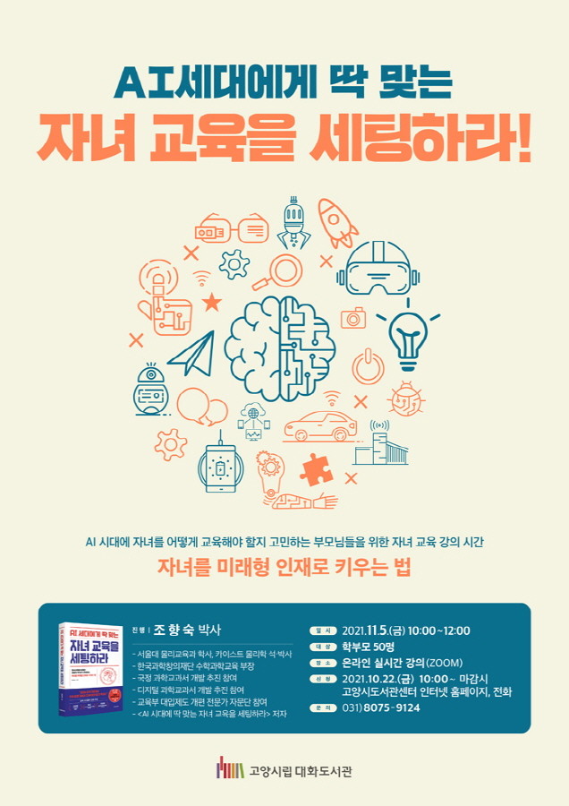 [부자동네타임즈 김인수기자] 고양시 대화도서관이 오는 11월 5일(금) 학부모 대상 진로독서 프로그램 AI세대에게 딱 맞는 자녀 교육을 세팅하라을 온라인 운영한다.