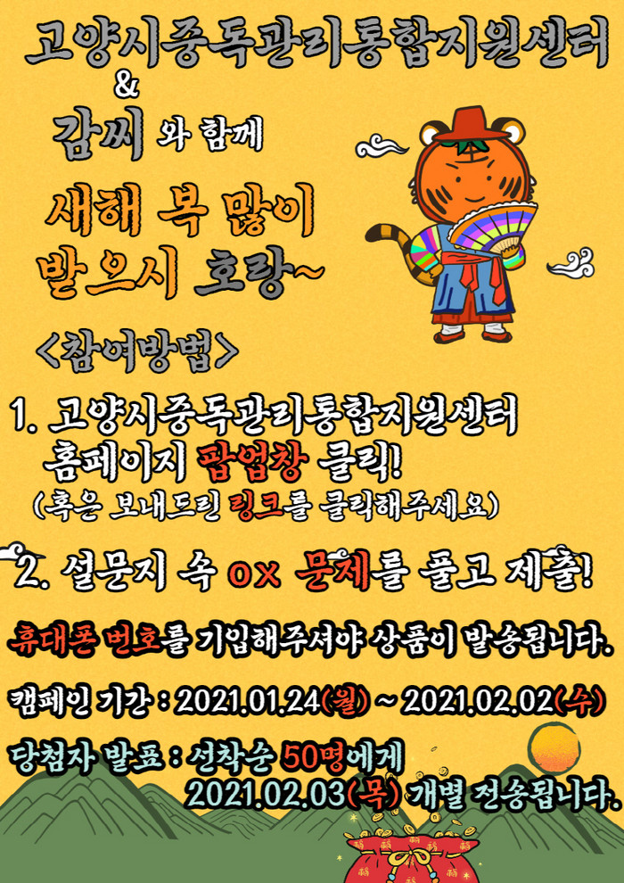 [부자동네타임즈 김인수기자] 고양시 중독관리통합지원센터가 새해를 맞이하여 온라인 캠페인 ‘새해 복 많이 받으시호랑’을 2월 2일(수)까지 진행한다.
