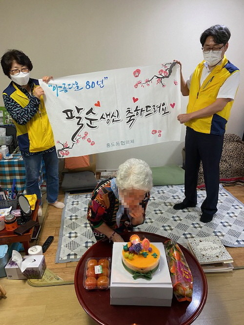 찾아가는 팔순잔치는 흥도동 지역사회보장협의체 특화사업으로 관내 거주 중인 기초생계급여 수급자 중 올해 팔순을 맞은 1941년생 독거노인 대상 가정에 직접 찾아가 생신을 축하하는 사업이다.
