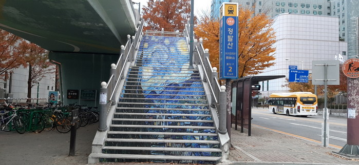 정발산 등산로 입구 건강계단은 ‘숲길 풍경’, 아람누리 앞 보도육교는 ‘명화’를 그려 시민들이 즐겁게 계단을 오를 수 있도록 힘을 보태준다.