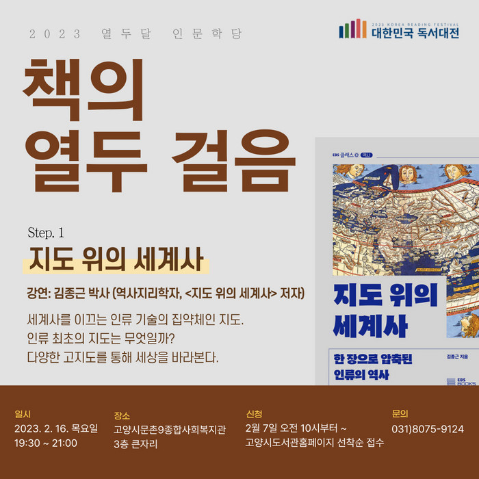 책의 첫 번째 발걸음은 고양시문촌9종합사회복지관으로 향한다. 동북아역사재단 연구위원으로 동서양 고지도를 연구하며 활약하고 있는 김종근 역사지리학자를 초청하여 ‘지도 위의 세계사’라는 주제로 강연한다.