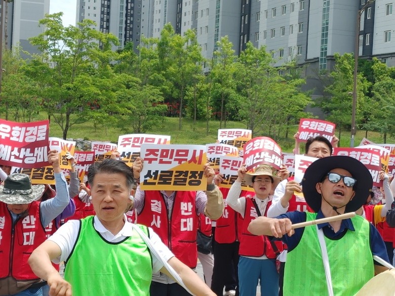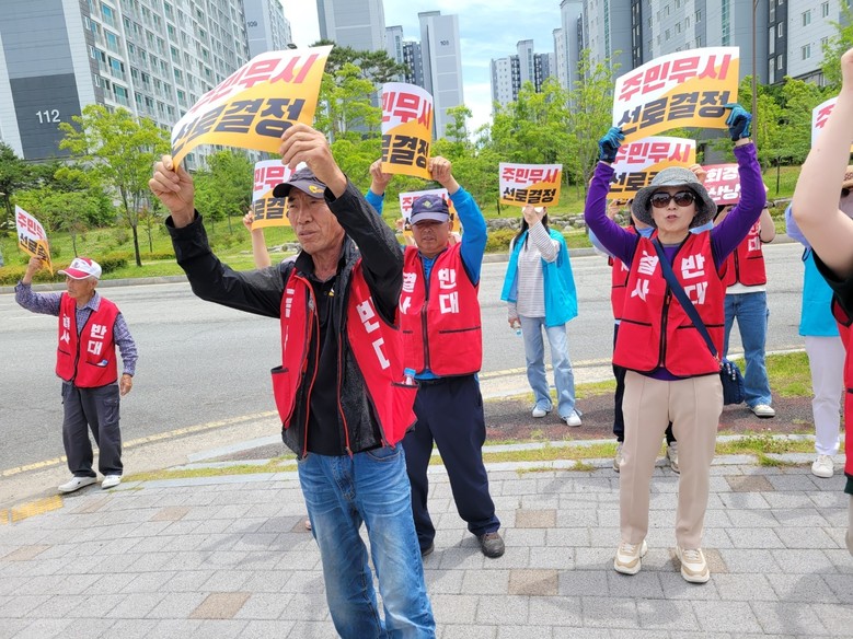 27일 충남 금산군 지역주민 120여 명이 나주 본사 앞에서 집회를 열고 “지역주민의 의견 수렴 전혀 없이 일방적인 사업추진으로 수백억 원의 사업비가 낭비되는 원거리 우회 경로로 최적경과대역 결정(2023.12.22)에 대해, 부실 경영에도 수백억 원의 사업예산이 낭비되고 최적경과대역 선정과정의 절차상 문제점을 제기하며, 최적경과대역 결정을 재검토하여 경로를 변경하라”고 항의 집회를 열었다.