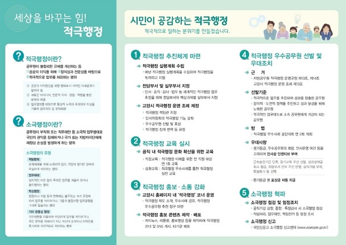 시는 적극행정 제도의 필요성과 사전컨설팅 제도 등을 소개하는 리플렛과 2020년 고양시 적극행정 우수사례를 담은 사례집을 각 2,000부씩 제작, 전 부서에 배부하고 적극행정 제도와 사례를 전파.공유할 계획이다.