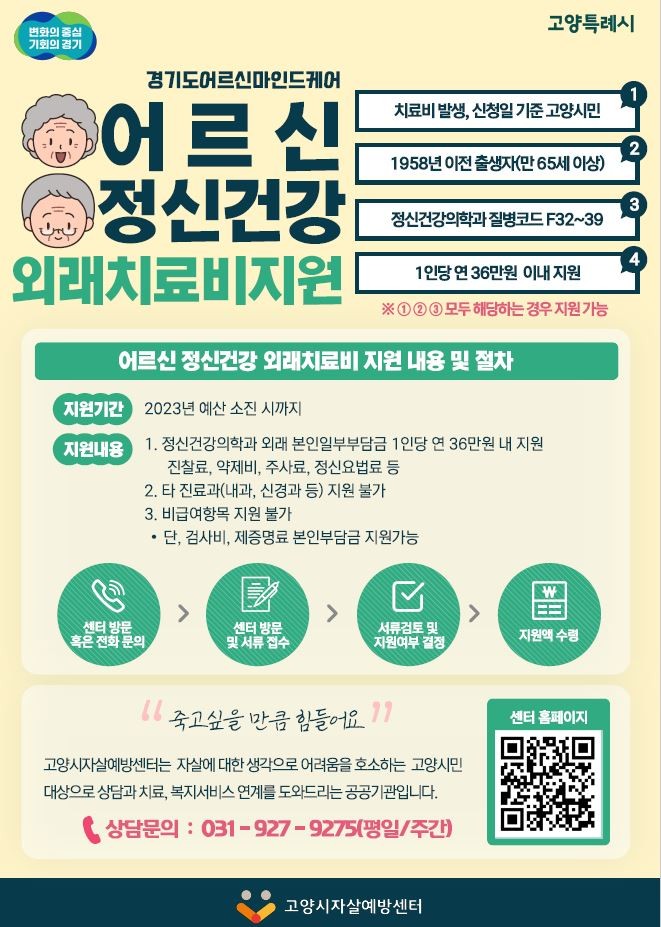 [부자동네타임즈 김인수기자] 고양시자살예방센터가 올해부터 고양시 거주 65세 이상 어르신의 정신건강을 위해 치료비 지원 사업을 시행한다.