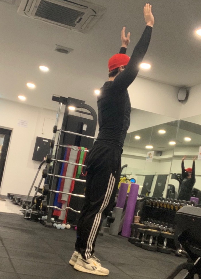 2,빠르게 두다리를 가슴 팎으로 이동 시키고 하늘 위로 손을 올려 점프한다. 실행-20초 버피 , 10초 휴식, 총 8회 실시.