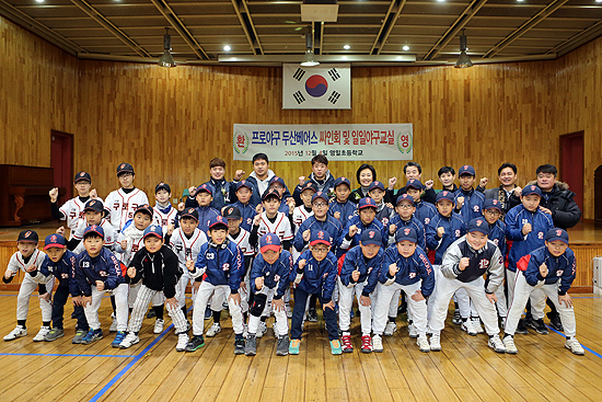 △ 프로야구 두산 민병헌, 오장훈, 남경호 등이 4일 서울 구로구 영일초등학교를 찾아 일일야구교실을 열고 선수 들과 기념촬영을 하고 있다. <사진제공=두산 베어스> |