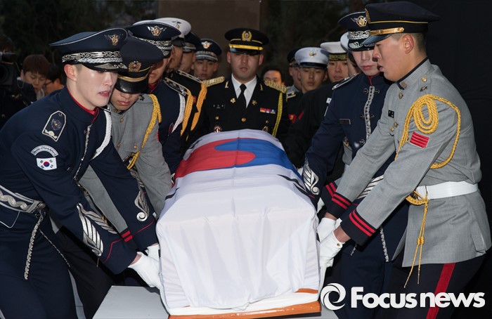 | △ 26일 오후 서울 동작구 국립현충원에서 故 김영삼 전 대통령 안장식이 엄수됐다. 김 전 대통령의 운구가 제단에 모셔지고 있다.<사진제공=포커스뉴스> |