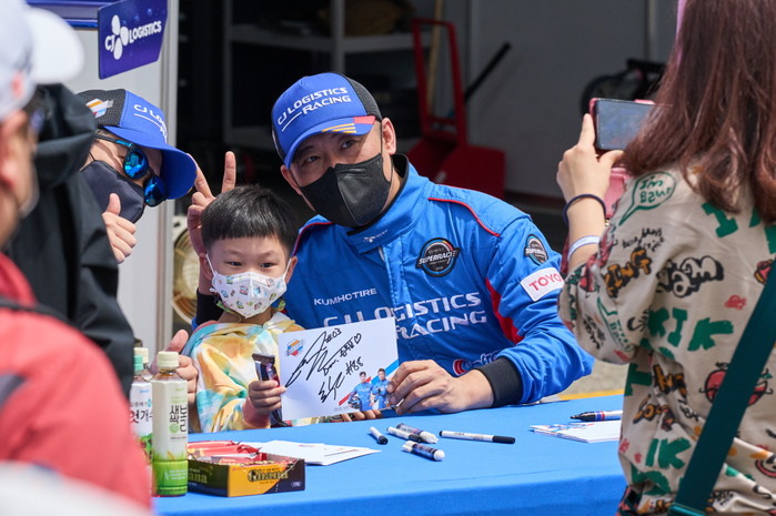[사진설명] CJ로지스틱스 레이싱의 정연일이 경기장을 찾은 한 어린이 팬과 함께 기념 사진촬영을 하고 있다.
