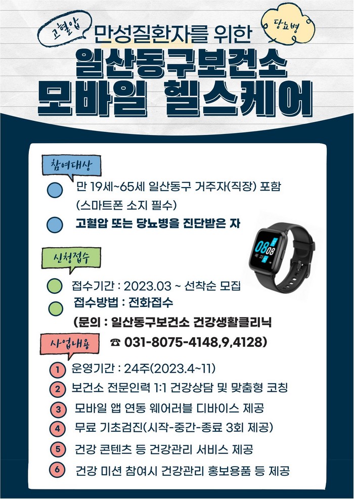 [부자동네타임즈 김인수기자] 고양특례시(시장 이동환) 일산동구보건소는 질환을 보유하지 않은 지역주민을 대상으로 비대면 건강관리 서비스를 제공하는 ‘2023년도 모바일 헬스케어사업’ 대상자를 고혈압 및 당뇨병을 진단받은 만성질환자도 확대해 운영한다.