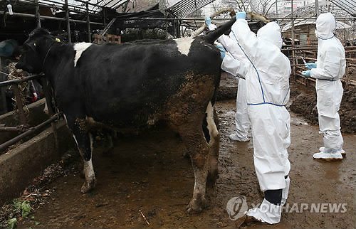 | △ 보건환경연구원 직원들이 검사를 위해 소의 피를 채혈을 하고 있다. (연합뉴스 자료사진) |