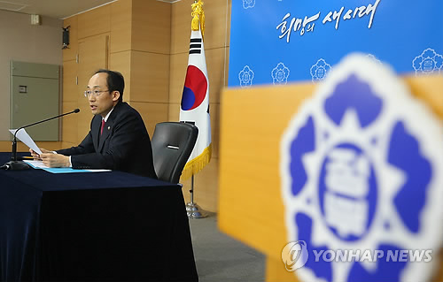 | △ 내각-청와대간 정책조정협의회 신설 발표 (서울=연합뉴스) 황광모 기자 = 추경호 국무조정실장이 1일 오전 서울 세종로 정부서울청사에서 정부 정책의 효율화를 위한 '내각-청와대간 정책조정협의회'를 신설하는 내용을 발표하고 있다. 정부는 각 부처 장관들과 청와대 수석들이 참가하는 정책조정협의회를 통해 최근 대두된 정책 혼선을 막고 효율성을 높인다는 계획이다. 2015.2.1 hkmpooh@yna.co.kr |
