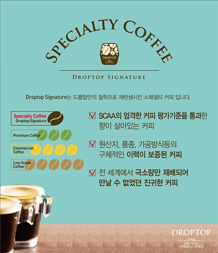 드롭탑 시그니처는 스페셜티 커피협회의 평가 기준에 부합한 원두를 사용한 것으로 '브라질 세라다스', '에티오피아 콩가', '과테말라 바랑카스' 3종의 싱글 오리진과 '브라질 세라다스'에 코코넛 슈가를 블렌딩한 흑당커피 등 총 4종이다.
