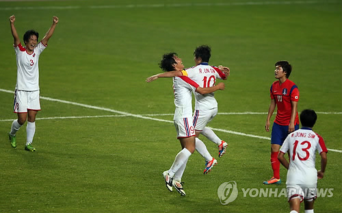 | △ 지난해 9월 29일 인천 문학경기장에서 열린 2014 인천 아시안게임 여자축구 4강전 한국과 북한의 경기에서 1대2로 패한 한국팀의 지소연(10)이 결승골을 터뜨린 북한 허은별(3)과 라은심(10), 정유리(9)의 환호를 지켜보며 허탈해하고 있다. <<연합뉴스DB>> |