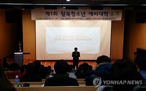 | △ 서울대에서 열린 '제1회 탈북청소년 예비대학' (서울=연합뉴스) 고은지 기자 = 서울대학교가 2일 오후 관악캠퍼스 기초사범교육협력센터에서 개최한 '제1회 탈북청소년 예비대학' 입학식. 올해 첫 시행되는 예비대학에는 탈북 청소년 30명과 서울대 학생 30명이 참석했다. 이들은 4박5일간 함께 숙식하면서 '멘토와 함께하는 공부방', '재외국민, 외국인과의 비정상회담!', 탈북 대학생 선배들과의 만남' 등 다양한 프로그램을 진행할 예정이다. 2015.2.2 <<사회부 기사 참조>> eun@yna.co.kr |