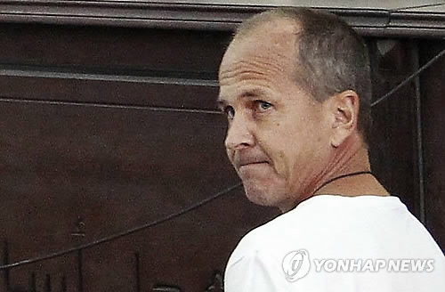 | △ (AP=연합뉴스) 테러단체 지원과 허위보도 등의 혐의로 이집트에 구금됐던 알자지라의 호주 출신 영어방송 기자 피터 그레스테가 1일(현지시간) 대통령령에 따라 추방돼 토라 교도소에서 출소한 직후 카이로를 떠났다고 보안 당국자가 말했다. 지난해 3월 그레스테가 함께 구금됐던 동료 기자들과 함께 카이로의 법원에 출두한 모습. |