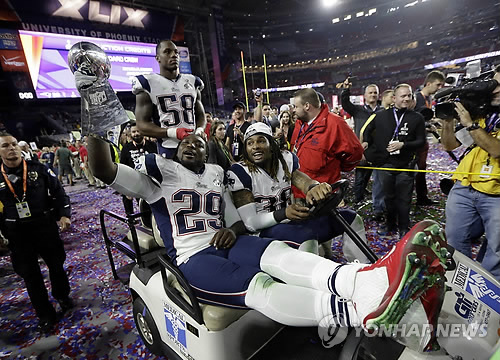 | △ 뉴잉글랜드, 10년 만에 '슈퍼볼' (AP=연합뉴스) 1일(현지시간) 미국 애리조나주 글렌데일의 피닉스대학 주경기장의 49회 미프로풋볼(NFL) 챔피언 결정전(슈퍼볼)에서 시애틀 시호크스를 꺾고 우승한, 뉴잉글랜드 패트리어츠의 러닝백 르개리트 블라운트(앞쪽)가 롬바르디 트로피를 들고 기뻐하고 있다. 뉴잉글랜드는 이날 4쿼터 막판 신인 세이프티 말콤 버틀러의 극적인 인터셉션에 힘입어 시애틀을 28-24(0-0 14-14 0-10 14-0)로 누르고 극적인 드라마를 연출했다. 이로써 뉴잉글랜드는 2002년, 2004~2005년에 이어 통산 네 번째로 슈퍼볼 정상을 밟았다. bulls@yna.co.kr New England Patriots running back LeGarrette Blount (29) holds up the Vince Lombardi Trophy as he celebrates with his teammates after the Patriots defeated the Seattle Seahawks 28-24 in NFL Super Bowl XLIX football game Sunday, Feb. 1, 2015, in Glendale, Ariz. (AP Photo/Mark Humphrey) |