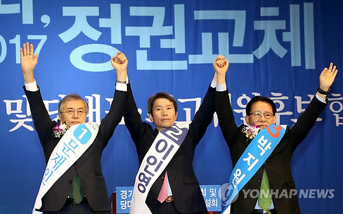 | △ 야당 당대표 후보 (수원=연합뉴스) 백승렬 기자 = 새정치민주연합 2·8전당대회에 출마한 박지원(오른쪽부터)·이인영·문재인 당대표 후보가 1일 수원 아주대학교 체육관에서 열린 경기합동연설회에서 손을 들어 지지자들에게 답례하고 있다, |