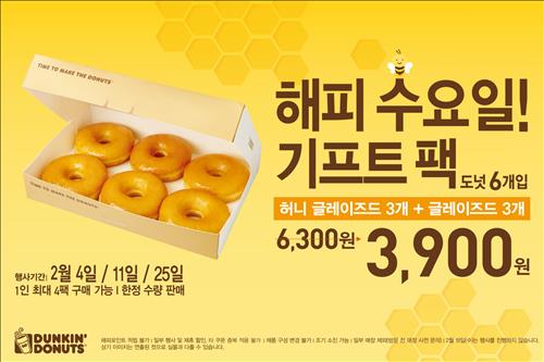수요일(4일, 11일, 25일)에는 던킨도너츠 '허니 글레이즈드' 3개와 '글레이즈드' 3개를 한 세트로 구성해 정상가격보다 2천400원 할인된 3천900원에 한정 수량 판매한다. 1인 최대 4팩까지 구입할 수 있다.