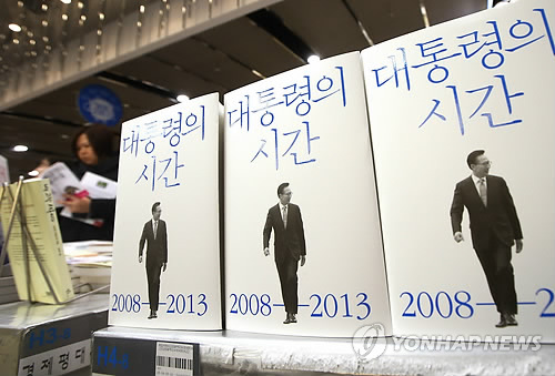| △ 서점에 나온 MB 회고록 '대통령의 시간' (서울=연합뉴스) 김주성 기자 = 1일 오후 서울 광화문 교보문고에서 이명박 전 대통령의 회고록 '대통령의 시간'이 판매되고 있다. 이 회고록에는 이 전 대통령의 재임 시절 남북관계, 자원외교, 세종시 수정안 부결 사태 등과 관련한 비사 등이 있다. 2015.2.1 utzza@yna.co.kr |