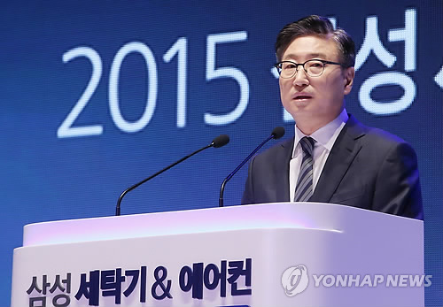 | △ 윤부근 삼성전자 대표 "세탁기 1천만대이상 판매 목표" (서울=연합뉴스) 서명곤 기자 = 3일 오전 서울 서초구 서초동 섬성전자 다목적홀에서 열린 '2015 삼성전자 세탁기 & 에어컨 미디어데이' 행사에서 윤부근 CE(소비자가전)부문 대표이사가 인사말을 하고 있다. |