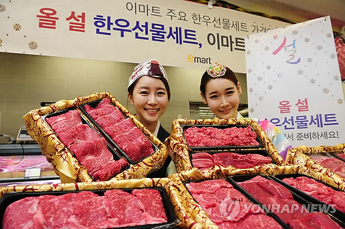 | △ '설 한우선물세트 저렴하게 구입하세요' (서울=연합뉴스) 4일 오전 서울 이마트 용산점에서 모델들이 한우 선물세트를 선보이고 있다. 이마트는 최근 하락한 한우시세를 반영해 전년 동기 대비 3~7% 저렴한 가격으로 한우선물세트를 판매하고 있다. 2015.2.4 << 이마트 제공 >> photo@yna.co.kr |