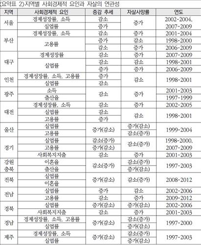 사회경제적 요인과 자살률 사이의 상관관계는 각 지역별 분석에서도 마찬가지였다.서울의 경우 경제성장률과 소득이 감소한 2002~2004년과 실업률이 증가한 2007~2009년 자살사망률이 증가했다.