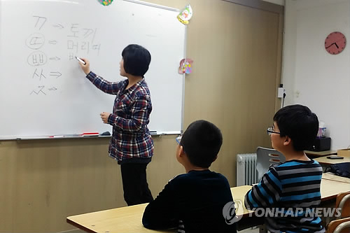 | △ 한국어 교육받는 중국동포 아이들 (서울=연합뉴스) 고현실 기자 = 지난달 23일 서울 대림동의 한 사립학원에서 중국동포 아이들이 한국어를 배우고 있다. 중국동포가 설립한 이 학원은 중도입국한 아이들에게 한국어와 기초 교과과정을 가르치고 있다. 2015.2.4 okko@yna.co.kr |