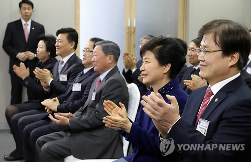 | △ 충북창조경제혁신센터 출범식 (청주=연합뉴스) 도광환 기자 = 박근혜 대통령이 4일 오전 충북 청주시 오송읍 충북지식산업진흥원에서 열린 충북창조경제혁신센터 출범식에서 구본무 LG 회장, 최양희 미래창조과학부 장관 등과 함께 박수치고 있다. |