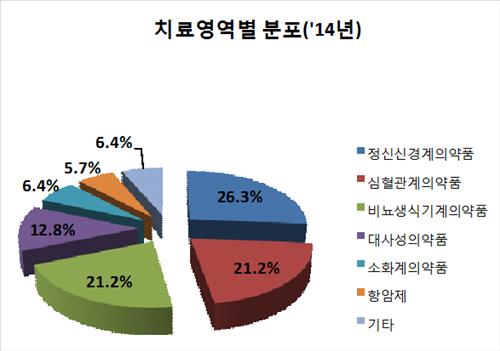 치료영역별로는 소염진통제, 우울장애, 관절염치료제 등 정신신경계의약품이 41건(26.3%)으로 가장 많았다. 정신신경계의약품 생동성 시험이 심혈관계의약품을 제치고 가장 많이 승인된 것은 2011년 이후 처음이다.