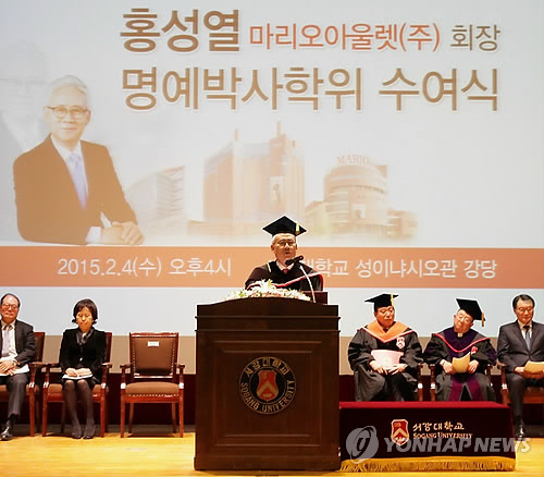 | △ 홍성열 마리오아울렛 회장, 서강대서 명예박사 학위 (서울=연합뉴스) 정빛나 기자 = 서강대는 홍성열 마리오아울렛 회장에게 명예 경제학 박사 학위를 수여했다고 5일 밝혔다. 지난 4일 오후 서울 마포구 서강대학교에서 열린 명예학위 수여식에서 홍성열 회장이 인사말을 하고 있다. 2015.2.5 << 서강대 제공 >> shine@yna.co.kr |