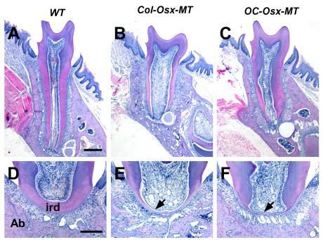 | △ 치아뿌리 형성과정에서의 오스테릭스 역할 규명 실험. 정상생쥐(A, D)에서는 치아 뿌리와 치아뿌리 사이의 상아질이 정상적으로 형성되지만 오스테릭스 유전자를 제거한 생쥐(B, C, E, F)에서는 상아모세포의 분화와 성숙이 일어나지 못해 치아뿌리가 짧아지고 치아뿌리 사이의 상아질도 얇아지는 이상이 초래된다. |
