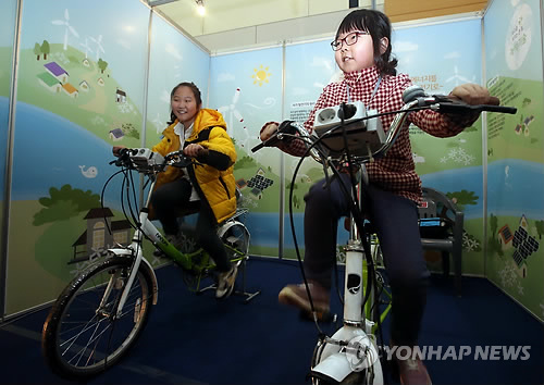 | △ 자전거 전기에너지 (대전=연합뉴스) 양영석 기자 = 대전 대덕특구 정부출연연구기관들의 연구성과물 전시회를 찾은 어린이들이 자전거를 이용해 전기에너지를 만들어보고 있다. 2015.2.5 youngs@yna.co.kr |
