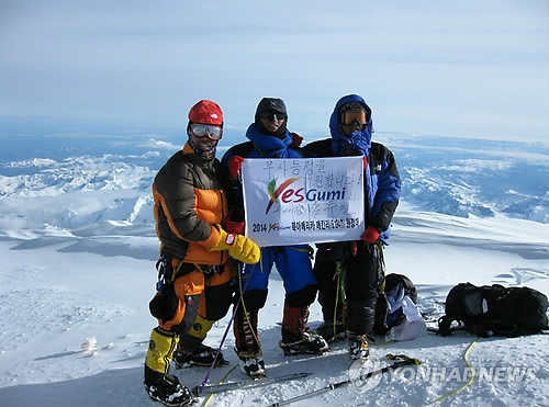 | △ 구미시산악연맹 매킨리산 등정 (구미=연합뉴스) '구미시산악연맹 7대륙 세계 최고봉 원정대'가 2014년 7월 2일 북아메리카 최고봉인 미국 알래스카주에 있는 매킨리산(6천194m) 등정에 성공한 뒤 구미시의 상징 깃발을 펴보이고 있다. << 연합뉴스DB >> |