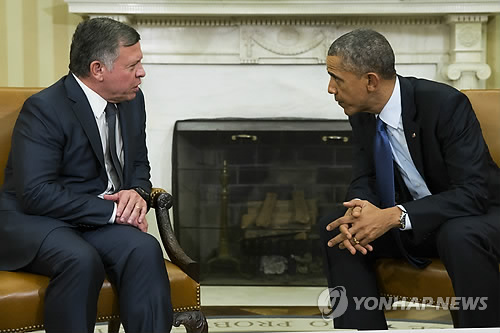| △ 버락 오바마(오른쪽) 미국 대통령이 지난 3일(현지시간) 백악관에서 요르단의 압둘라 국왕에게 수니파 원리주의 무장단체 '이슬람국가'(IS)에 억류됐다 피살된 요르단 조종사 마즈 알카사스베 중위의 피살에 애도를 표하고 있다. |