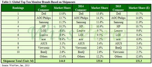 2013년 삼성전자로부터 1위 자리를 물려받은 델이 지난해 15.8%의 점유율로 1위 자리를 수성했고 AOC/필립스 합작법인이 14.3%로 2위에 올랐다.