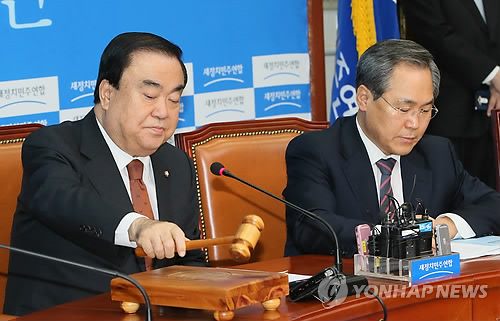| △ (서울=연합뉴스) 진성철 기자 = 새정치민주연합 문희상 비상대책위원장(왼쪽)이 6일 국회에서 마지막으로 확대간부회의를 주재하고 있다. |