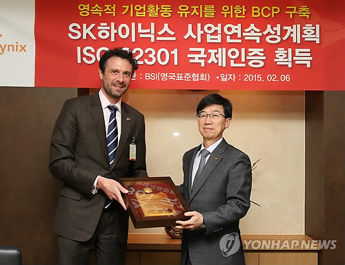 | △ SK하이닉스, 사업연속경영시스템 인증 획득 (서울=연합뉴스) SK하이닉스는 이천·청주사업장이 영국표준협회(BSI)로부터 사업연속성경영시스템 ISO22301 인증을 받았다고 6일 밝혔다. ISO22301은 재해·사고 등으로 업무가 중단됐을 때 생산·인력·물류 등 기업의 핵심사업을 최단 기간 내에 복구해 기업활동을 정상화하는 능력을 평가한다. 이날 경기도 이천시 SK하이닉스 본사에서 열린 인증 수여식에서 박성욱 SK하이닉스 CEO(오른쪽)와 앤드류 달글레이시 영국 부대사가 기념 촬영을 하고 있다. 2015.2.6 << SK하이닉스 제공 >> photo@yna.co.kr |