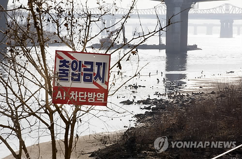 | △ 서울시, AI바이러스 발견 (서울=연합뉴스) 윤동진 기자 = 6일 오후 조류 인플루엔자(AI)가 검출된 서울 성동구 중랑천 부근에 출입금지라는 푯말이 설치돼 있다. |