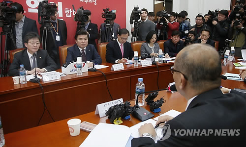 | △ 발언 듣는 새누리당 원내지도부 (서울=연합뉴스) 이상학 기자 = 새누리당 유승민 원내대표와 원유철 정책위의장이 6일 오후 국회에서 열린 건강보험료 개편 관련 당정 현안보고에서 문형표 보건복지부 장관의 발언을 듣고 있다. |