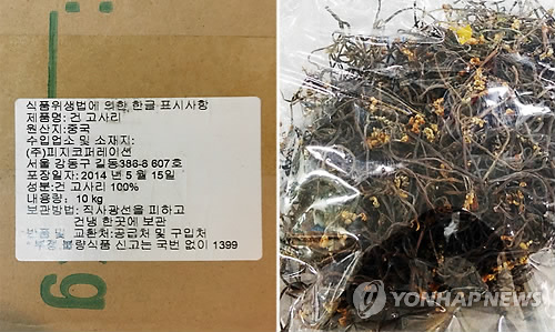 | △ 납, 카드뮴 기준초과 검출 수입 '고사리' 회수조치 (서울=연합뉴스) 식품의약품안전처는 (주)피지코퍼레이션이 수입·판매한 '건고사리'에서 중금속(납, 카드뮴)이 기준초과 검출되어 유통판매 금지하고 회수·폐기조치 중이라고 6일 밝혔다. 회수 대상 제품은 포장일자가 2014년 5월 15일로 표시돼 있는 제품이다. (식약처 제공) |