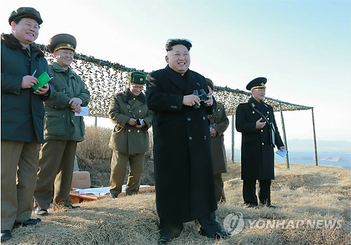 | △ (서울=연합뉴스) 북한이 신형 함대함로켓을 개발해 김정은 국방위원회 제1위원장이 지켜보는 가운데 시험발사를 진행했다고 노동신문이 7일 보도했다. 김 제1위원장이 간부들과 함께 흡족한 듯한 표정을 짓고 있다. |