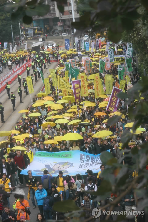 | △ 홍콩서 우산혁명 이후 최대 거리 행진 (홍콩=연합뉴스) 최현석 특파원 = 시민운동단체 민간인권진선은 1일 오후 시민 수천명을 이끌고 홍콩섬 코즈웨이베이 빅토리아 공원을 출발, 센트럴까지 행진하며 '정치적 제한 없는 행정장관(행정수반) 직선제' 실시를 요구했다. 이날 시위는 작년 12월 15일 끝난 79일간의 도심 점거 시위 이후 최대 규모로 기록됐다. 2015.2.1 <<국제뉴스부 기사 참조>> harrison@yna.co.kr |