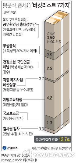 여권 관계자는 "이들 7가지 복지 구조조정 버킷리스트를 실천하면 12조원 넘는 재정지출이 절감돼 지난해 발생한 세수 결손액 11조원을 충분히 메울 수 있다"며 "이런 노력을 다 하고 나서 증세는 최후의 수단으로 검토해야 한다"고 말했다.