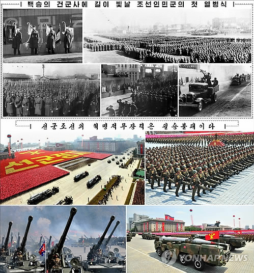 | △ 북한, 군열병식 '과거와 현재' 비교하며 무력 과시 (서울=연합뉴스) 북한 노동당 기관지 노동신문은 8일 정규군 창설 67주년을 맞아 1948년 군열병식 사진과 최근 열병식 사진을 연이어 싣고 무력을 과시했다. 북한이 37년 만에 2월8일을 '정규군 창설일'로 조명하며 연일 대대적 홍보에 나서는 것은 대북 압박수위를 높이는 미국과 한미연합군사훈련 등에 무력을 과시하려는 의도로 풀이된다. 2015.2.8 nkphoto@yna.co.kr |