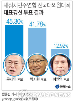 | △ <그래픽> 새정치연합 대표경선 투표 결과 (서울=연합뉴스) 반종빈 기자 = 새정치민주연합의 새 대표로 문재인 후보가 선출됐다. bjbin@yna.co.kr 페이스북 tuney.kr/LeYN1 트위터 @yonhap_graphics |