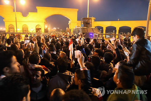 | △ 이집트 축구장 팬 난동…14명 사망 (AP/엘쇼루크紙=연합뉴스) 이집트 카이로 동북부의 축구장에서 입장권을 구하지 못한 자말레크팀 팬들이 8일(현지시간) 경기장 진입을 시도하다 경찰과 충돌하면서 14명이 숨지고 20명이 다쳤다. 자말레크팀 팬들이 경기장으로 강제로 몰려 들어가고 있는 모습. |